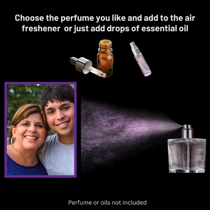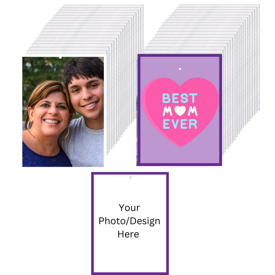 Introducing the Photo Air Freshener - a customizable way to freshen up any space with your favorite photos and quotes! Simply add your own scent and enjoy the personal touch in your car, home, or closet. Includes a double-sided area, string for hanging, and endless possibilities. Transform your space today!