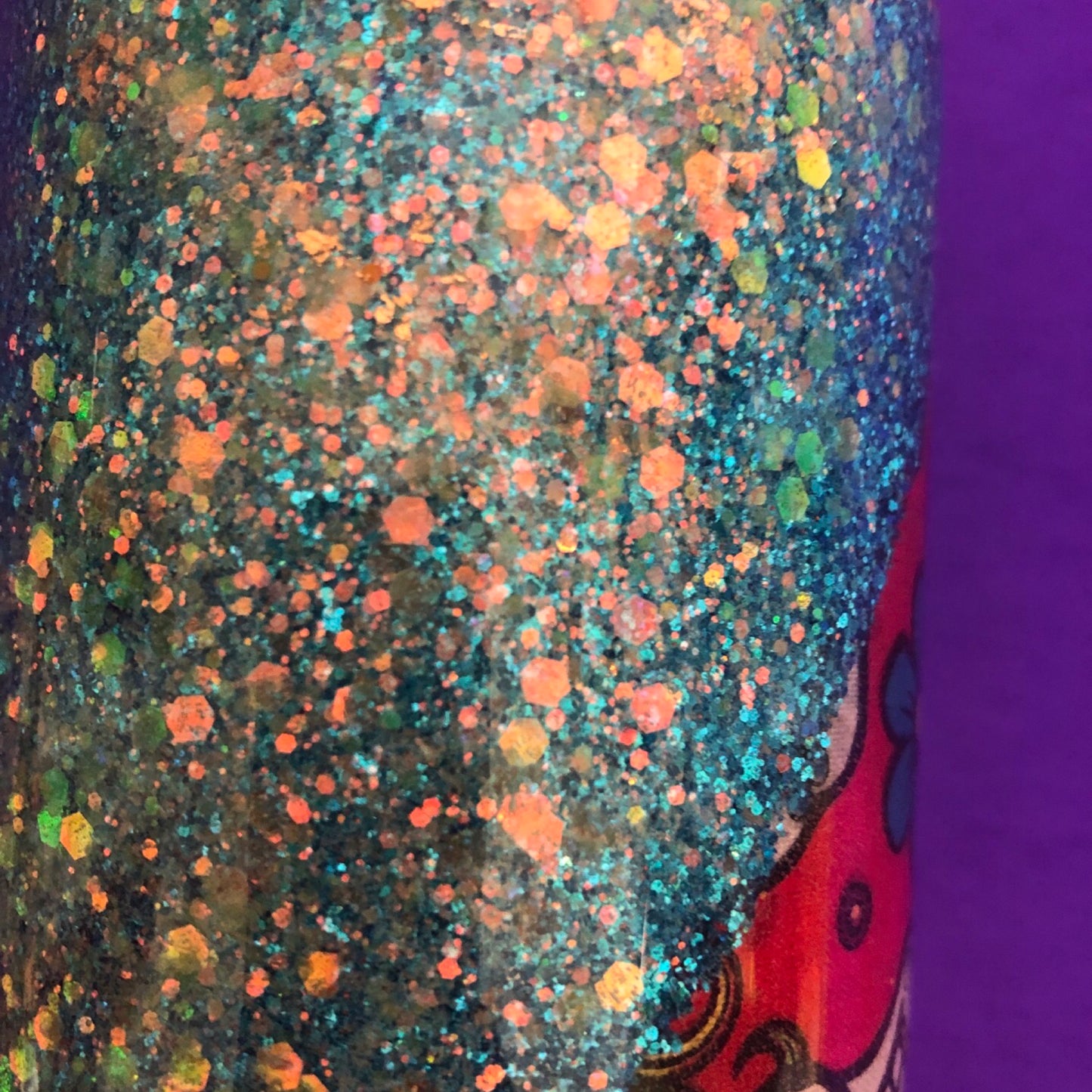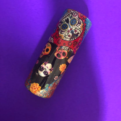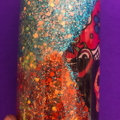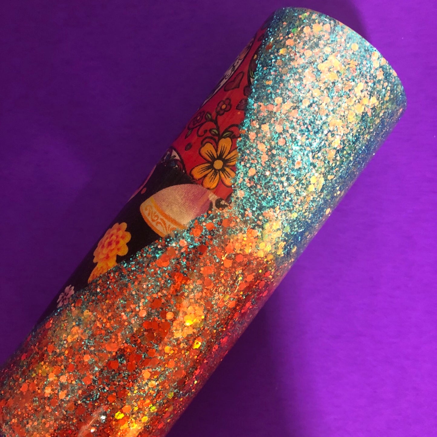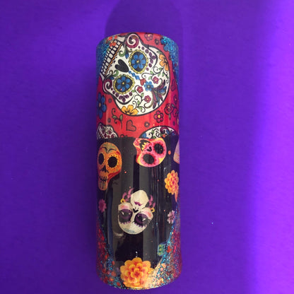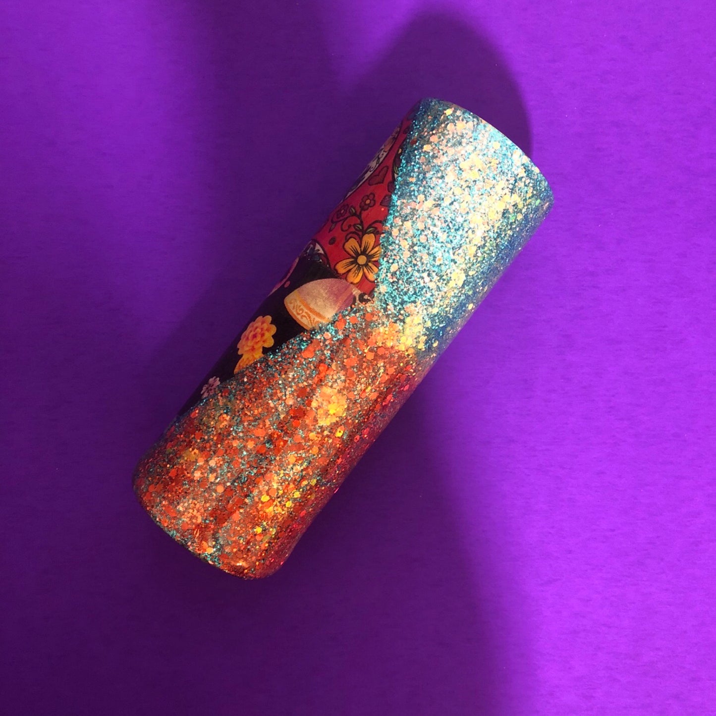 This bright and vivid cup reminds me of Carnival and Day of the dead mixed together. It has sugar skulls, flowers glitz and glitter.