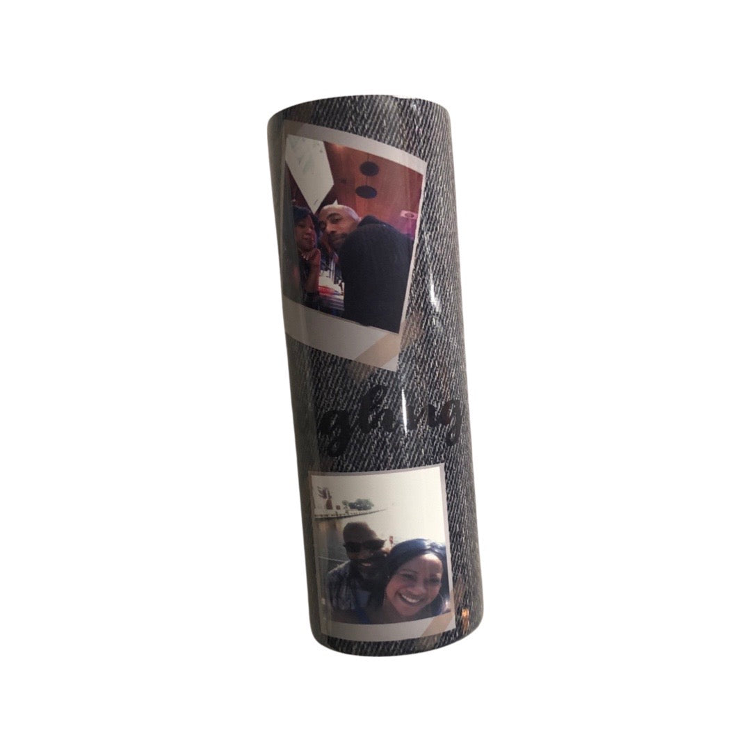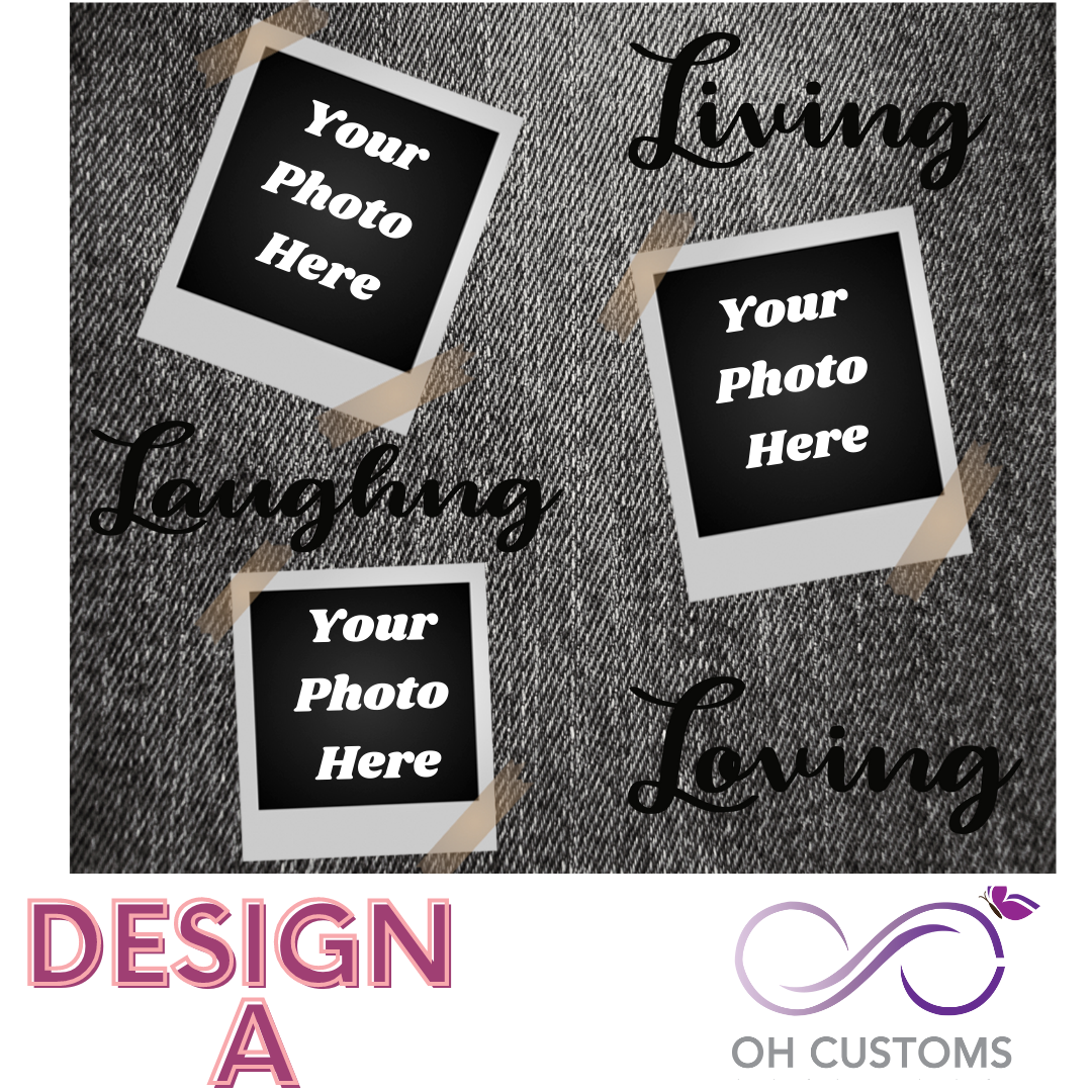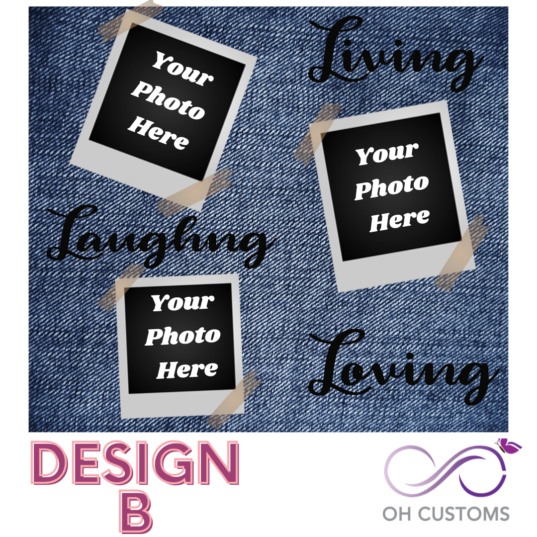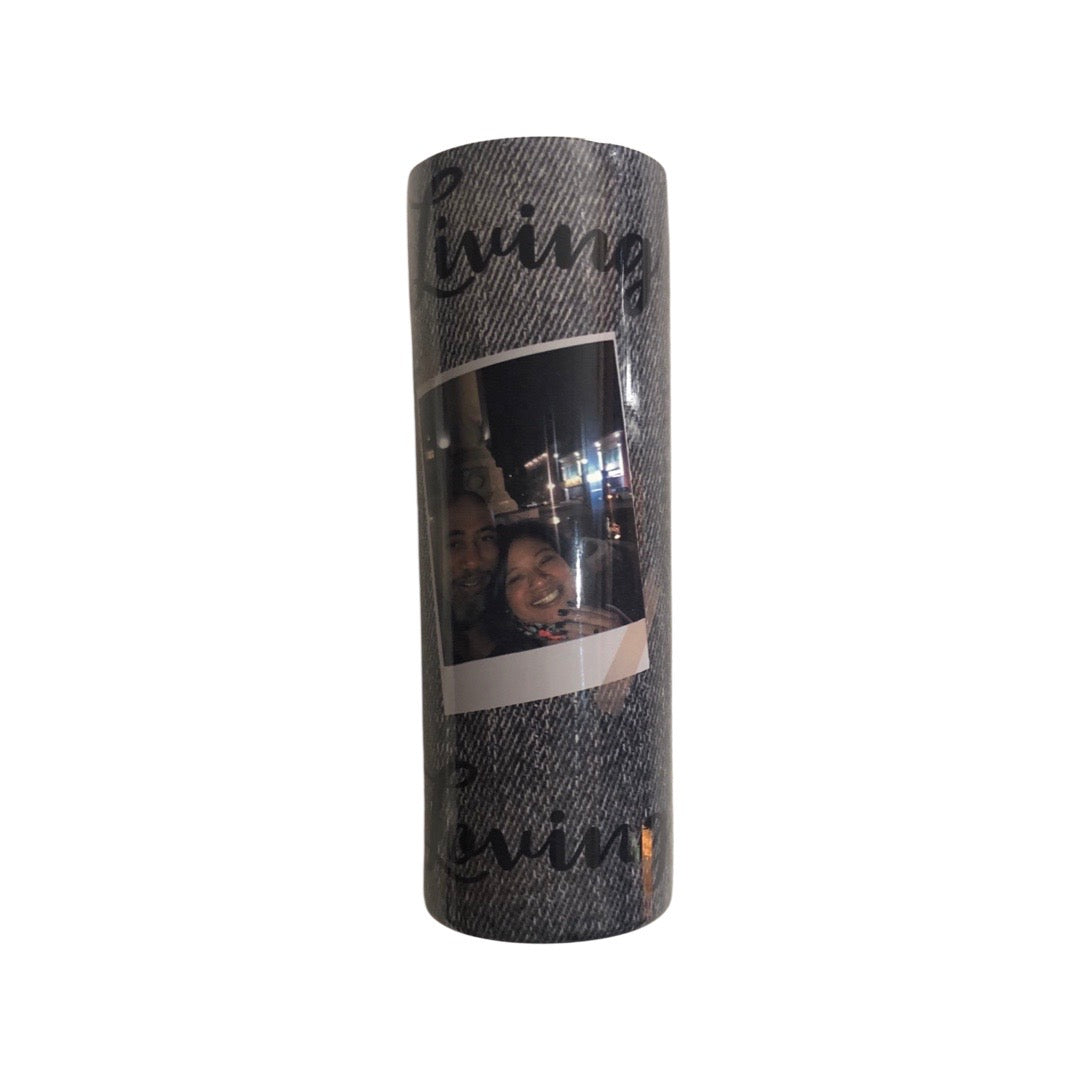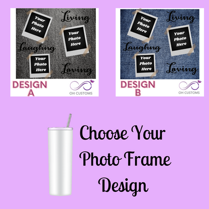 Capture your special memories with the Living, laughing, loving Photo frame sublimation cup /tumbler. Personalize it with your own photos and choose from blue or black denim with the heartfelt quote. Perfect for gifting to loved ones on any occasion, it's a thoughtful and unique way to show your love."