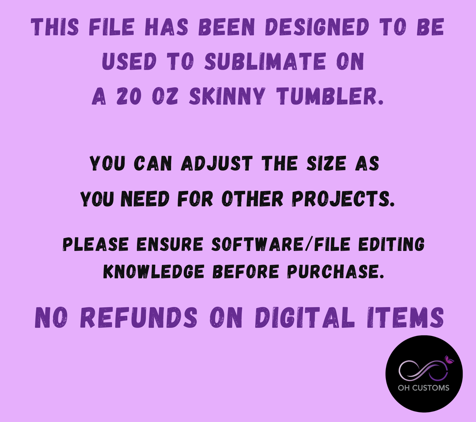 THIS FILE HAS BEEN DESIGNED TO BE USED TO SUBLIMATE ON A 20 OZ SKINNY TUMBLER. You can adjust the size as you need for other projects. Please ensure software/file editing knowledge before purchase. NO REFUNDS ON DIGITAL ITEMS.