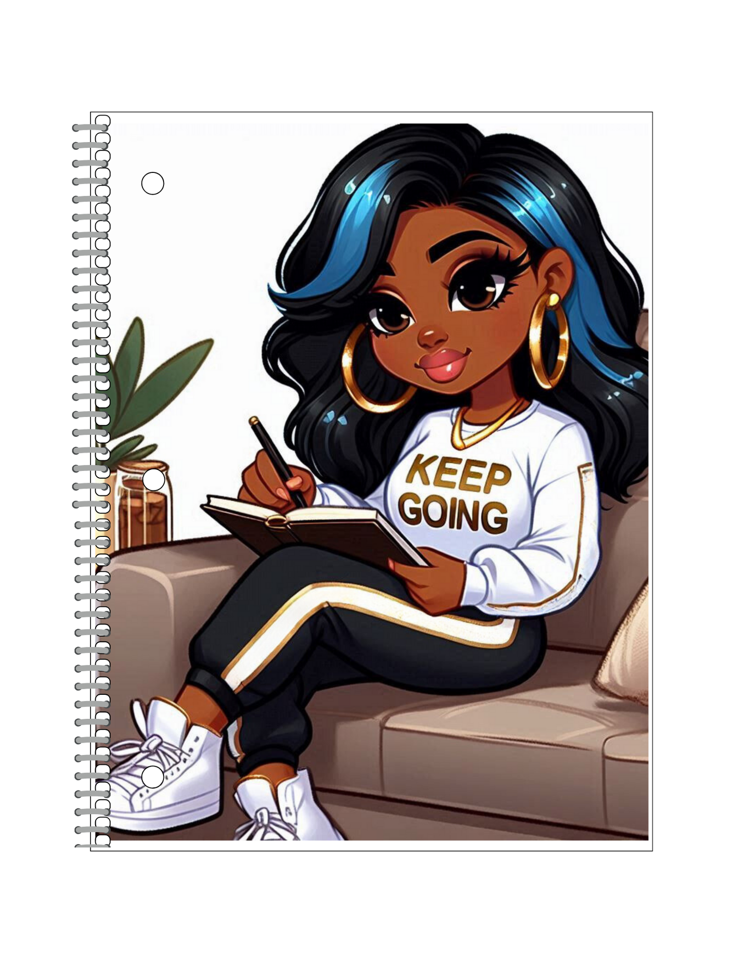 With our Keep Going Notebook, you'll be inspired to keep pushing towards your goals. Featuring a stylish cover with a fierce black woman writing and the words "Keep Going" emblazoned on her shirt, this notebook is the perfect companion for your writing journey. Let this cute, blue-haired writer motivate you to keep going.