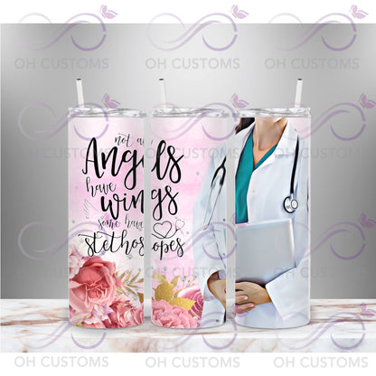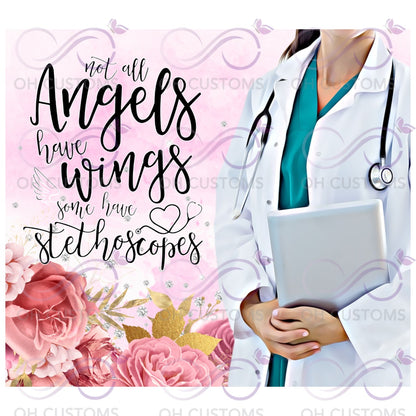 These Nurse Angel Wings 20 oz Printed Tumblers will remind you that not all angels have wings; some have stethoscopes! Featuring a beautiful picture of a nurse holding a clipboard, these tumblers are the perfect way to show your admiration for nurses and their dedication. Who said angels don't have stethoscopes?