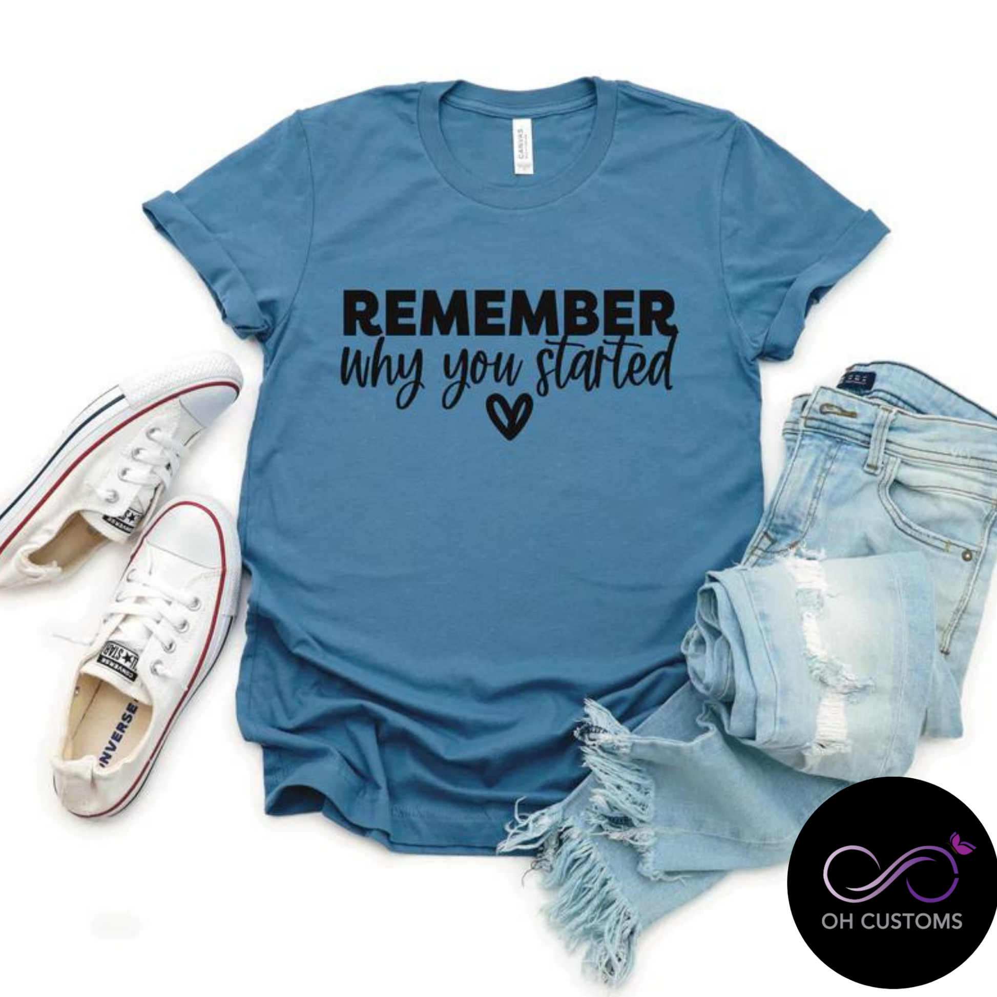 This white 100% unisex cotton T-Shirt is designed with a motivational message that reads "Remember Why you Started", accompanied by a small heart underneath. Perfect for those who believe in the value of persistence and determination.