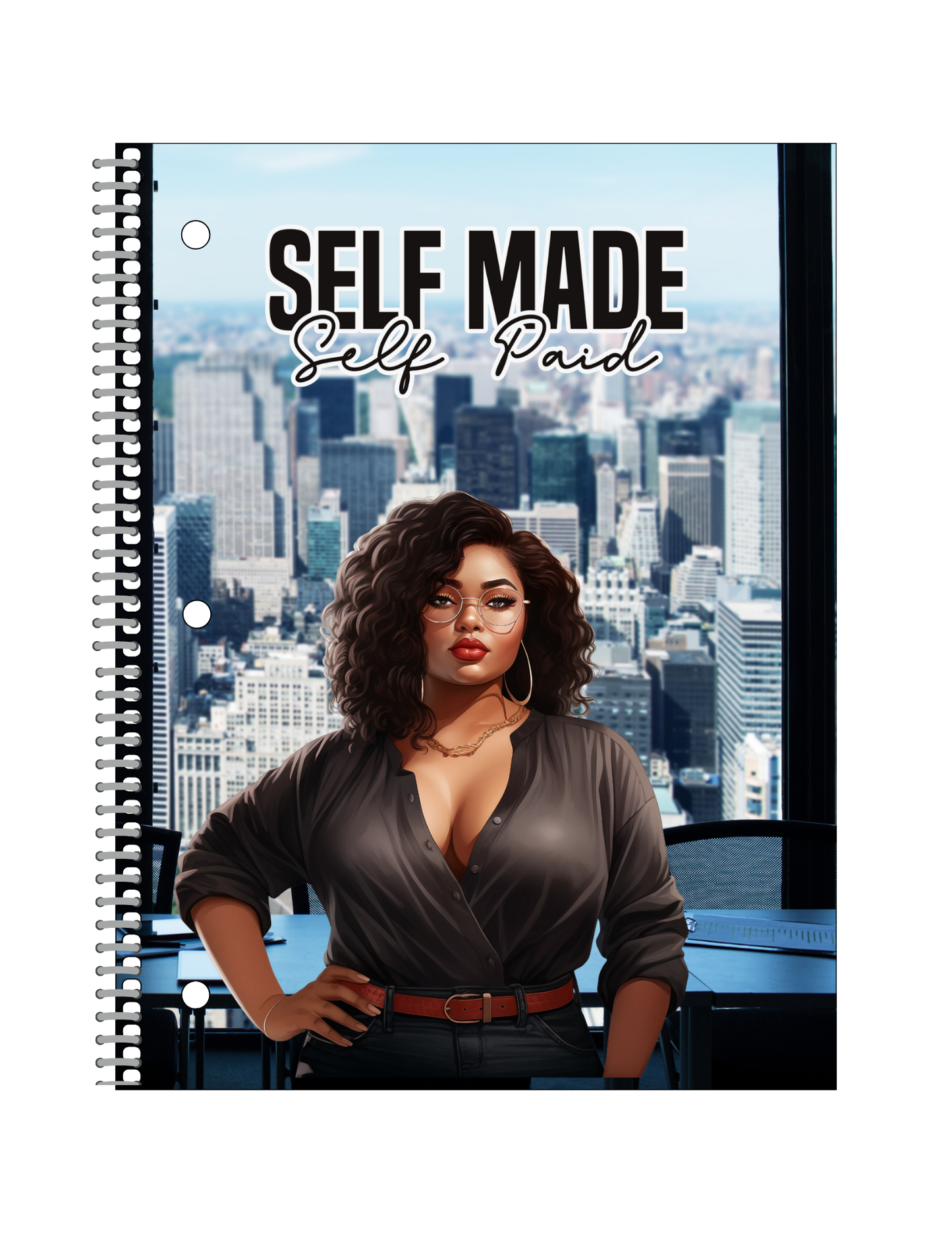 Introducing the Self Paid Self Maid Notebook - a stylish lined sheet notebook that will make you feel like a boss. With its unique design featuring a stylish Sista standing in front of a city view, this notebook is perfect for school or writing. Be confident and show off your style with this notebook.